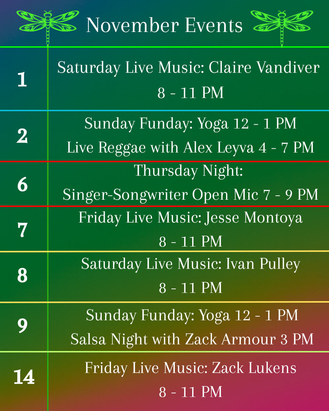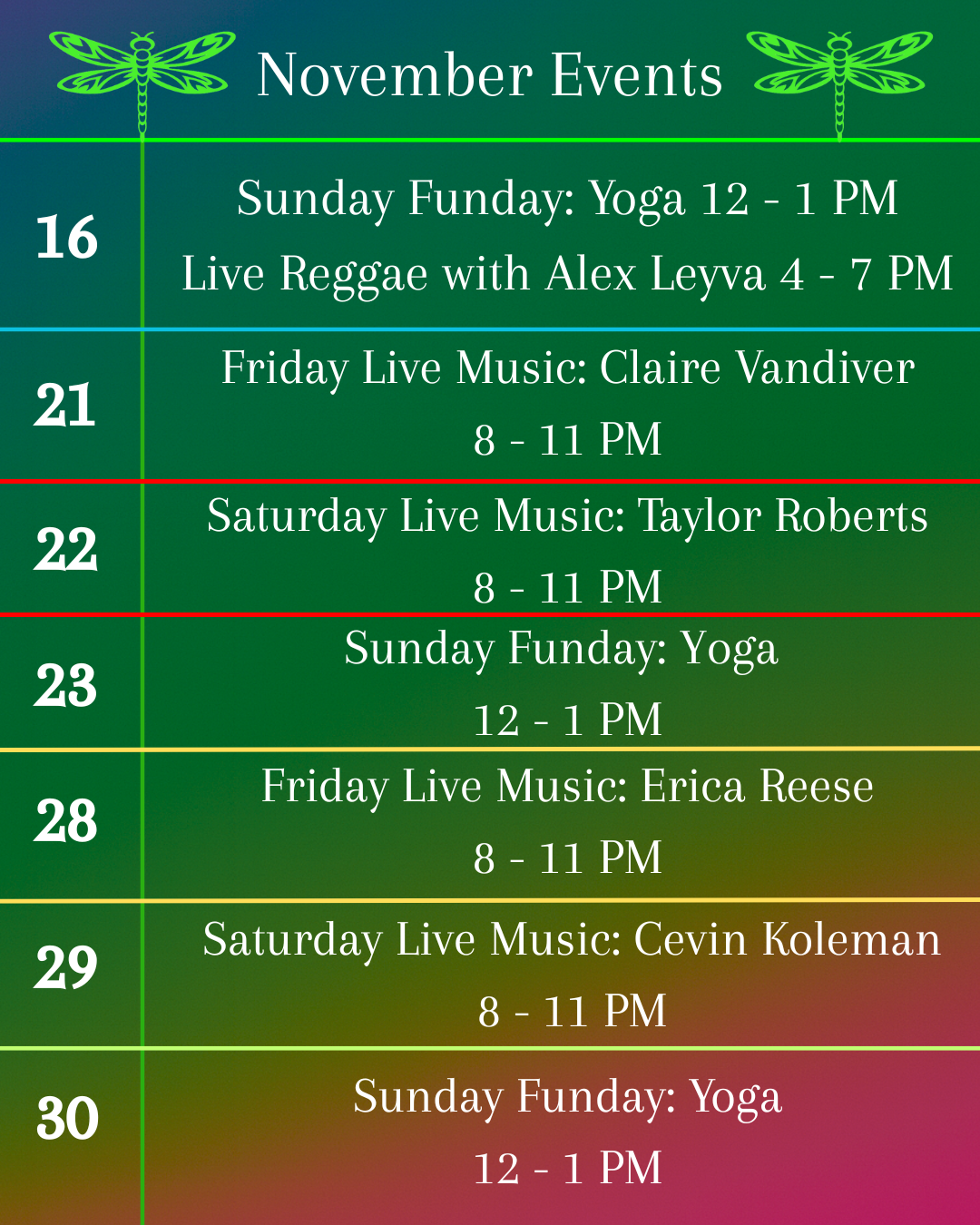 Step into a unique social space where live music sets the mood, handcrafted mocktails infused with your choice of THC, CBD, Kava, or Kratom elevate your experience, and retro video games bring out your playful side. Whether you’re here to unwind, connect with friends, or simply enjoy the atmosphere, Dragonfly Lounge is your go-to spot for relaxing, vibing, and having fun.