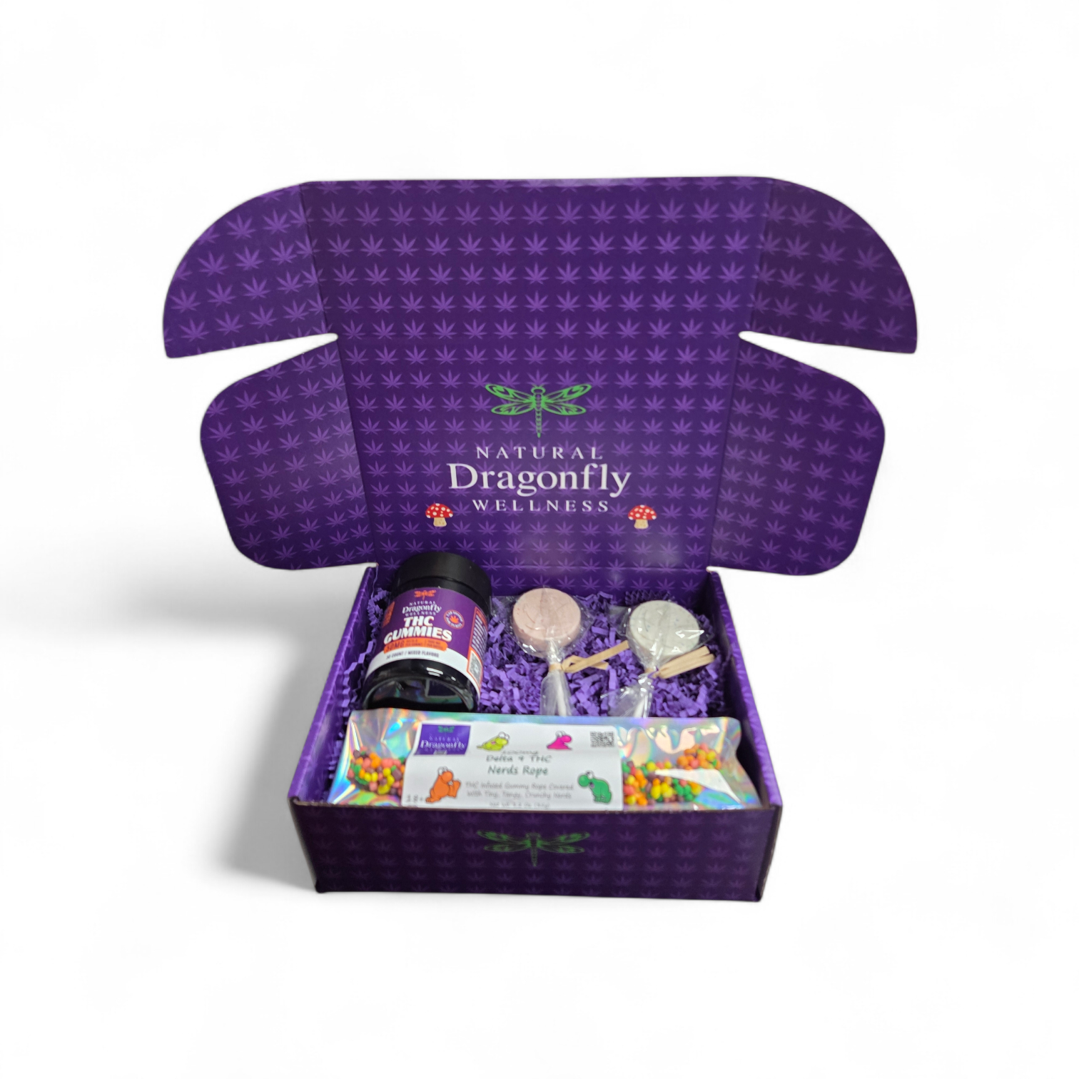 This X-Mas Box Contains: 1 Jar 30 count Gummies, 100mg Delta-9 Nerds Rope, & 2 White Chocolate Lolli Pops (50mg each). CAN NOT COMBINE WITH COUPONS.